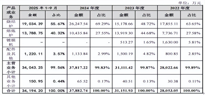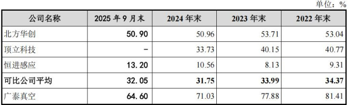 2019年12月20日,广泰高科以2元/注册资本的价格认缴广泰有限150万元新增注册资本,26名激励对象通过出资到员工持股平台再向公司增资的方式间接持有激励股权。胡颖以2元/注册资本的价格受让刘顺钢直接持有的120万元广泰真空注册资本。 2023年10月11日,员工持股平台普通合伙人刘顺钢以1元/合伙份额的价格将其持有的56万合伙份额转让至激励对象,激励对象通过受让刘顺钢持有的员工持股平台出资额间接持有激励股权。本次变动后,广泰高科合伙人人数为27人,相较首次股权激励后新增9人,退出8人。 2024年5月8日,员工持股平台普通合伙人刘顺钢以1元/合伙份额的价格将其持有的31万合伙份额转让至激励对象,激励对象通过受让刘顺钢持有的员工持股平台出资额间接持有激励股权。本次变动后,广泰高科合伙人人数为35人,相较第二次股权激励后新增8人,退出0人。 截至招股说明书签署日,广泰高科持有公司股份数量300万股,持有公司股份比例为4.45%。 2024年增收反降利,毛利率波动且低于可比同行均值 广泰真空主营业务为真空装备的研发、制造和销售。公司主要产品包括真空烧结炉、真空熔炼炉、真空镀膜机等真空设备,下游应用广泛,包括稀土永磁行业、储氢材料加工行业、光伏领域、机械电子加工行业、金属加工行业等。近年来,稀土永磁行业为公司收入占比最高的下游行业。公司主要客户包括中科三环、金力永磁、宁波韵升、北方稀土、宁波复能等行业内知名稀土永磁材料生产企业。 2022年-2025年1-9月,公司营业收入分别为2.805亿元、3.115亿元、3.788亿元和3.419亿元,净利润分别为4425.59万元、7303.45万元、6894.41万元和7667.47万元。 报告期各期,公司计入当期收益的政府补助分别为712.50万元、2,371.64万元、897.43万元及564.85万元,占当期净利润的比重分别为16.10%、32.47%、13.02%及7.37%。 广泰真空预计2025年1-12月营业收入为40,800万元至41,400万元,同比增长7.70%至9.29%;预计2025年1-12月归属于母公司所有者的净利润为7,910万元至8,510万元,同比增长14.74%至23.44%;预计2025年1-12月归属于母公司所有者的扣除非经常性损益后的净利润为7,790万元至8,390万元,同比增长14.58%至23.40%。公司业绩增速较快,主要得益于稀土永磁材料行业进入高景气的发展周期,公司稀土永磁领域的订单金额及业务占比快速提升。 报告期内,公司主营业务收入主要包括烧结炉、熔炼炉、镀膜机等,各报告期主营业务收入分别为2.802亿元、3.111亿元、3.782亿元和3.404亿元,占营业收入的比重分别为99.89%、99.87%、99.83%和99.56%。
